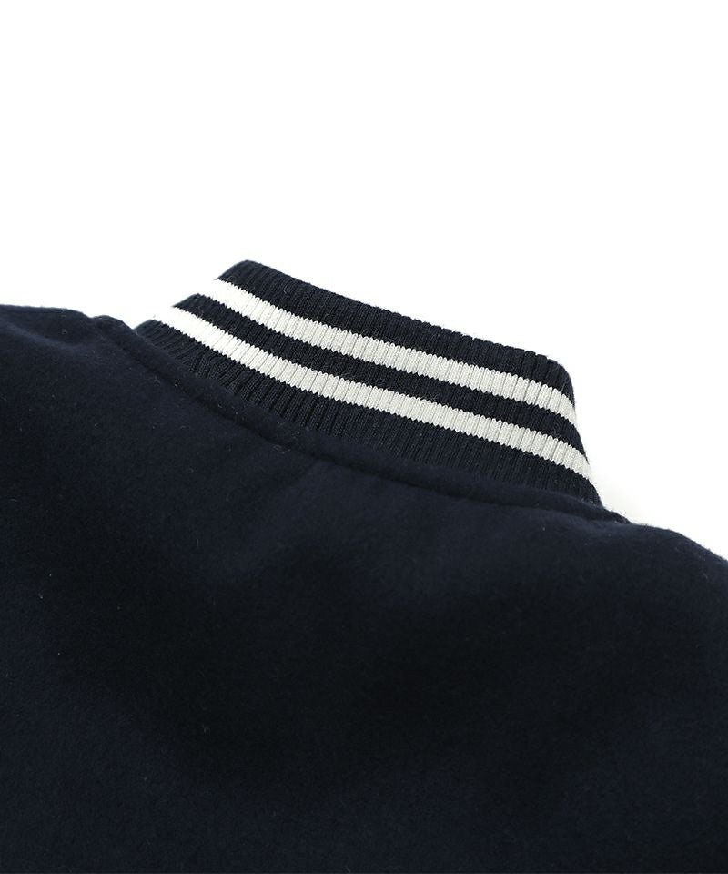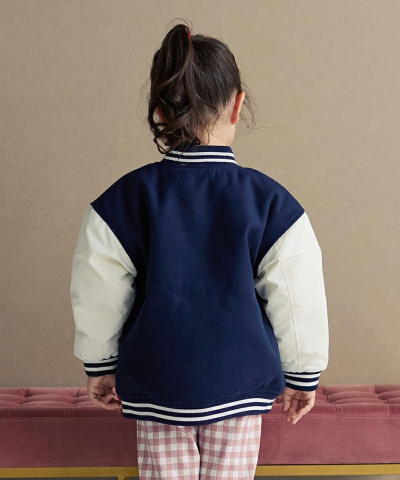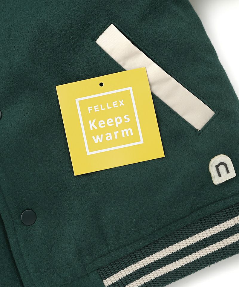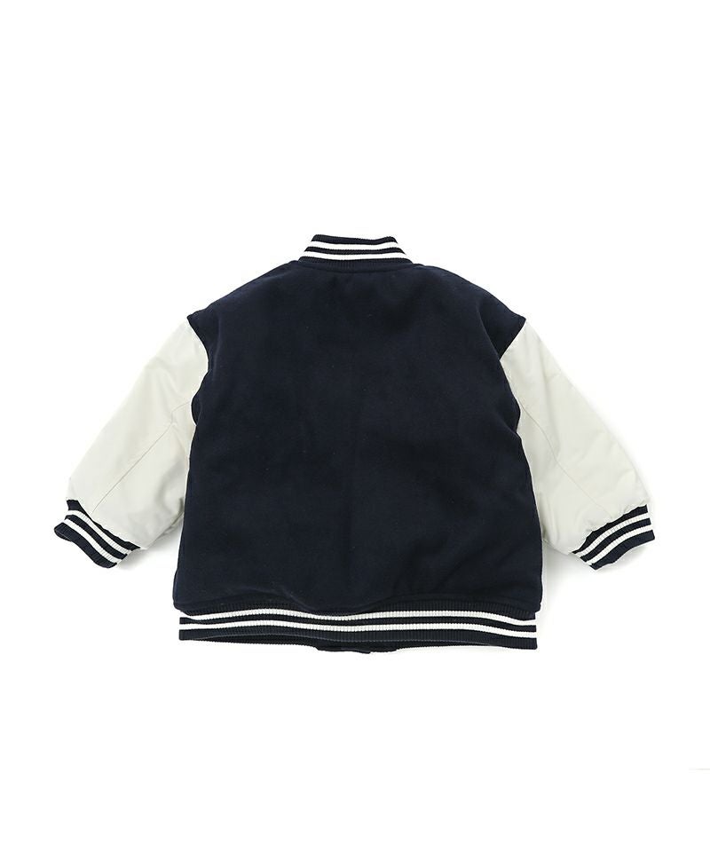 トレンドムードたっぷりなスタジャン☆身頃は上質なフェイクウールを使用し、お袖にはマットなタフタを使用することで、本格スタジャン見えしながらも軽くて動き易いデザインに。全体に蓄熱機能綿を入れているのでしっかりと防寒も出来るジャンパーです。スウェットやデニム、スカートなど合わせる物で印象が変わるのも楽しい1着☆