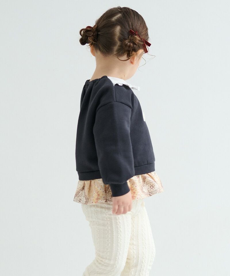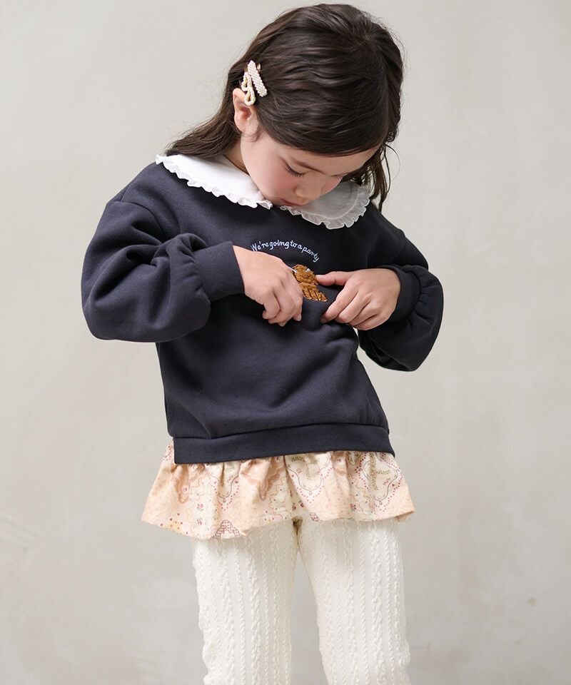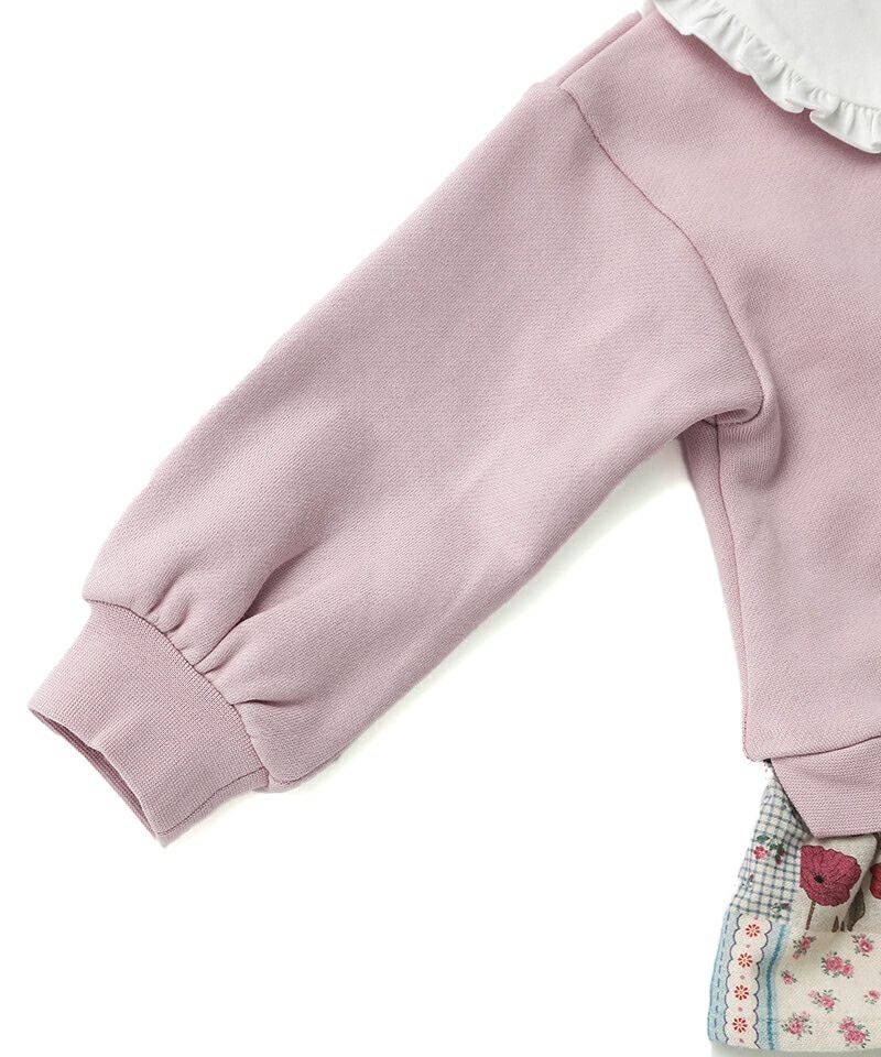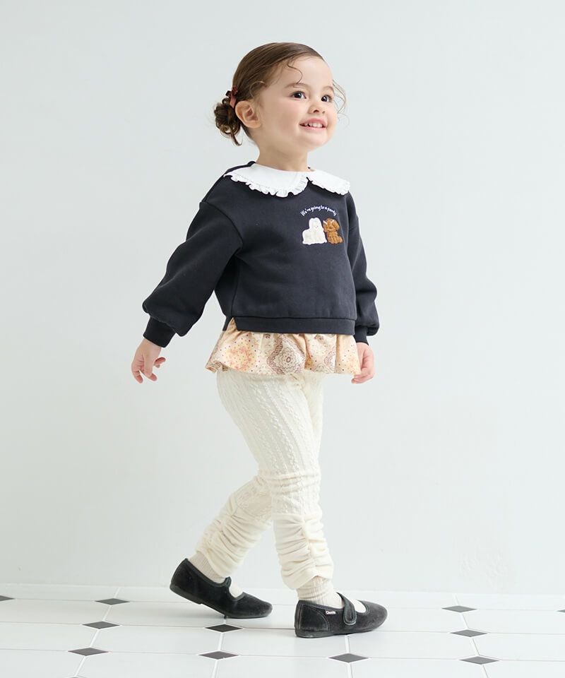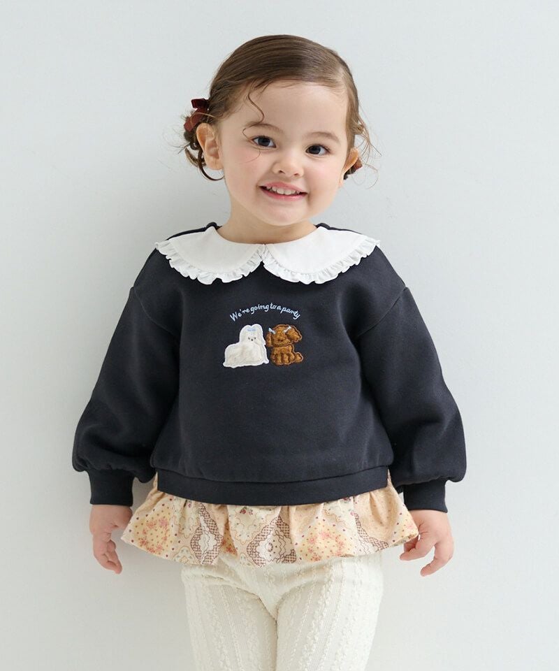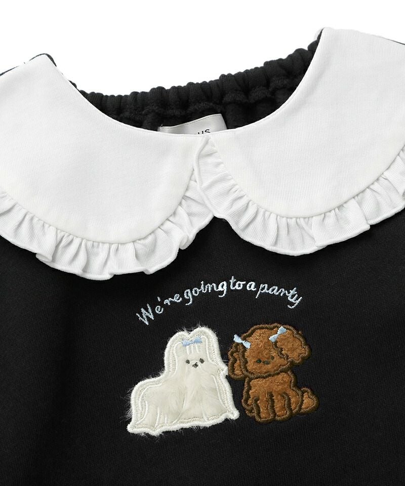 レトロムード漂うプルオーバーはガーリーな中にも洗練さを感じるカラーリング。白い衿があることで、すっきりとした上品さも兼ね備えています。遊び心あるフェイクファーとボアのワンちゃん刺繍も素敵です♪