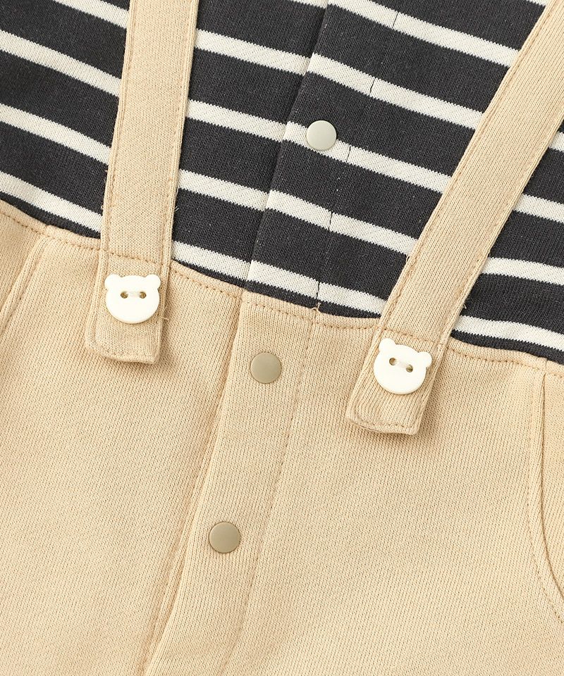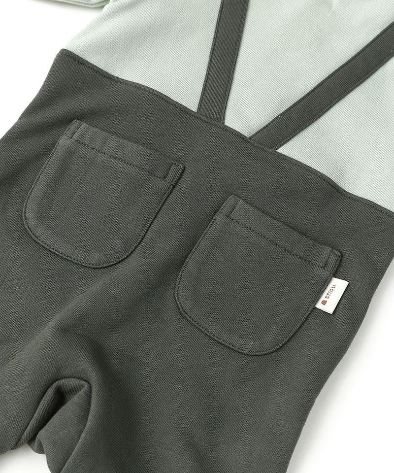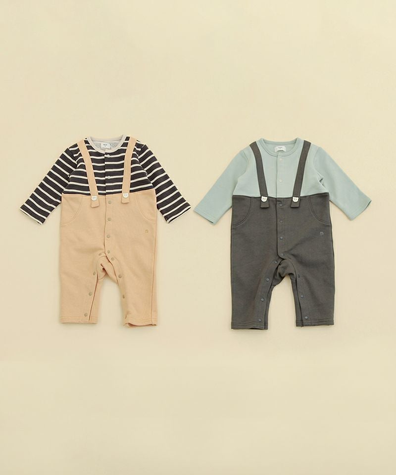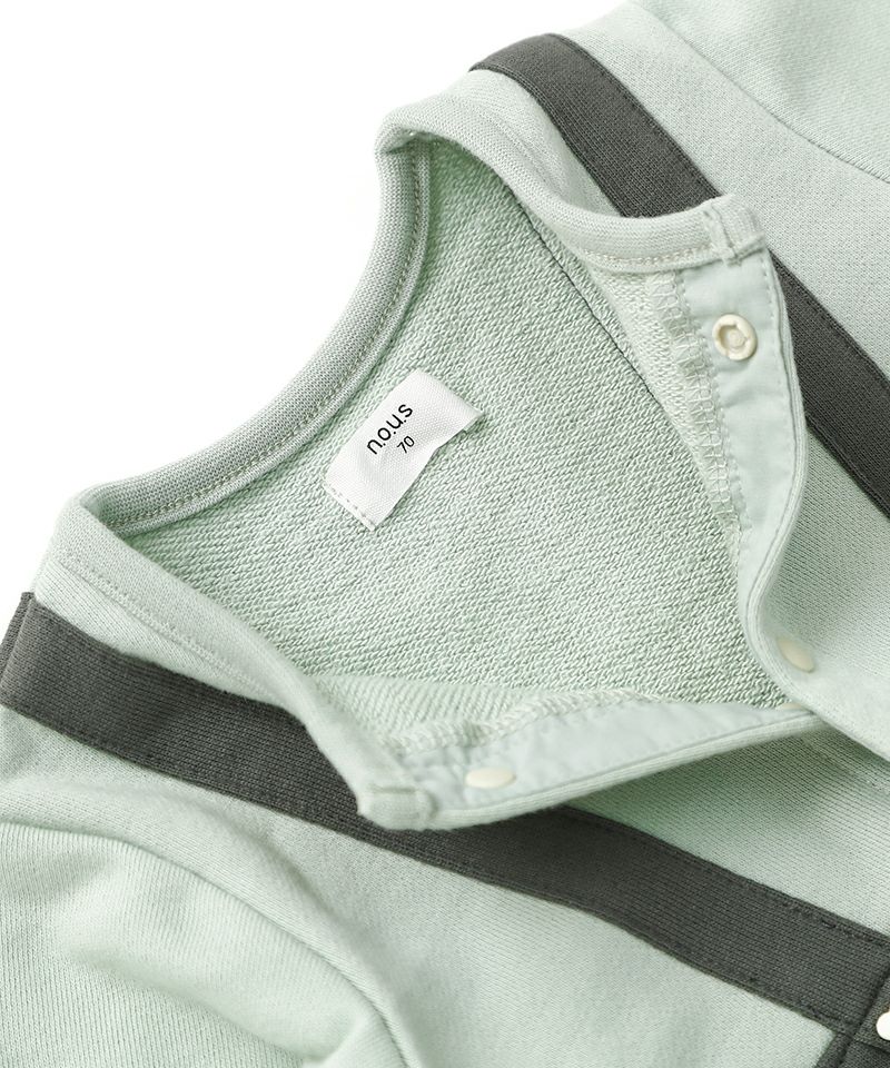nousらしい大人っぽいカラーリングのカバーオールはママパパとのリンクコーデも楽しそう♪レイヤード風アイテムなのでギフト映えも叶う1枚です。シンプルなお袖なのでカーディガンやパーカーなども羽織りやすく、冬はじめから春先まで活躍できるアイテムです。