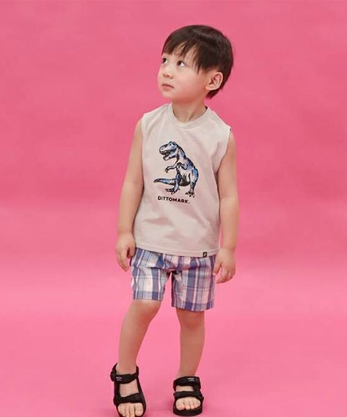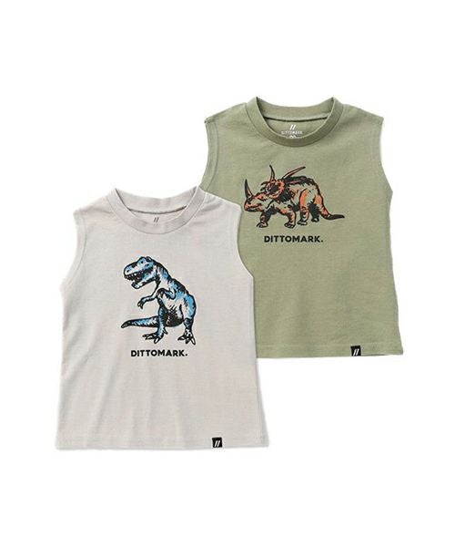 恐竜のフロントプリントがインパクト大なノースリーブタイプ。暑い夏を楽しく過ごせる一枚です。