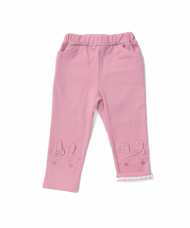 チャーミングなうさぎちゃんの顔がポイントのロングパンツ。ストレッチの効いたデニムニット素材は動きやすく、お出かけや遊びにも大活躍してくれます。 裾をくるっとロールアップするとちらりと見えるレースがとってもキュート!コーディネートに合わせた色々なスタイルを楽しめます。両サイドにポケット付きです。