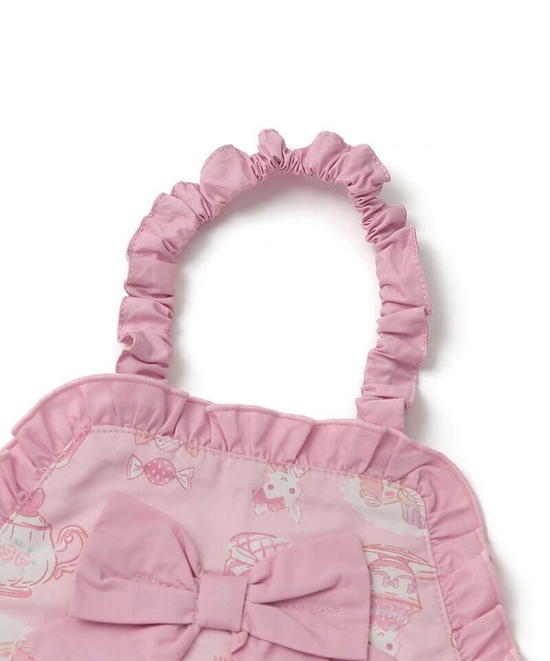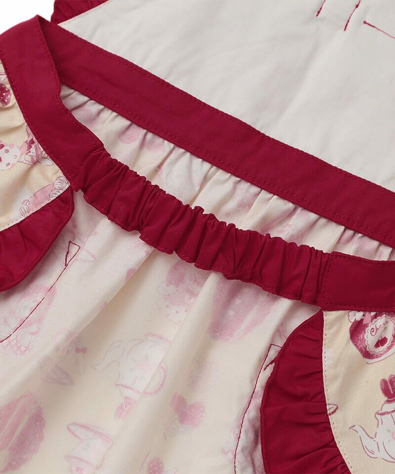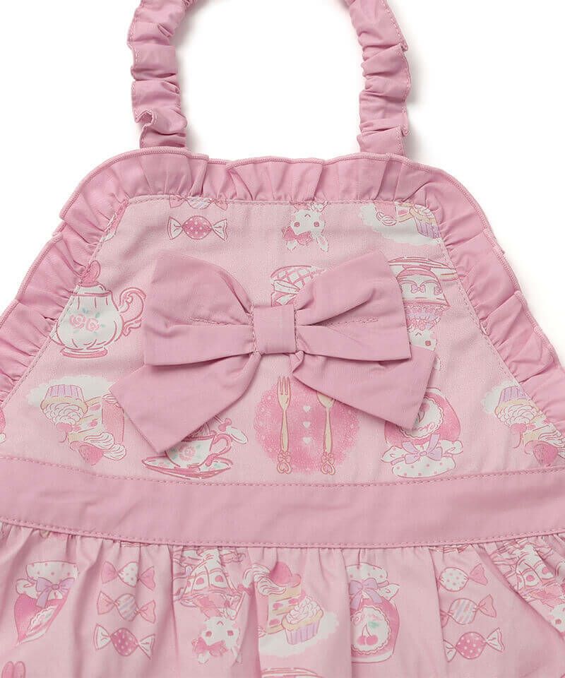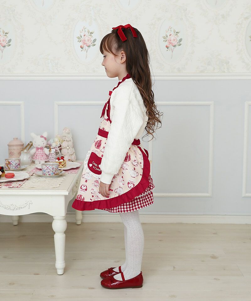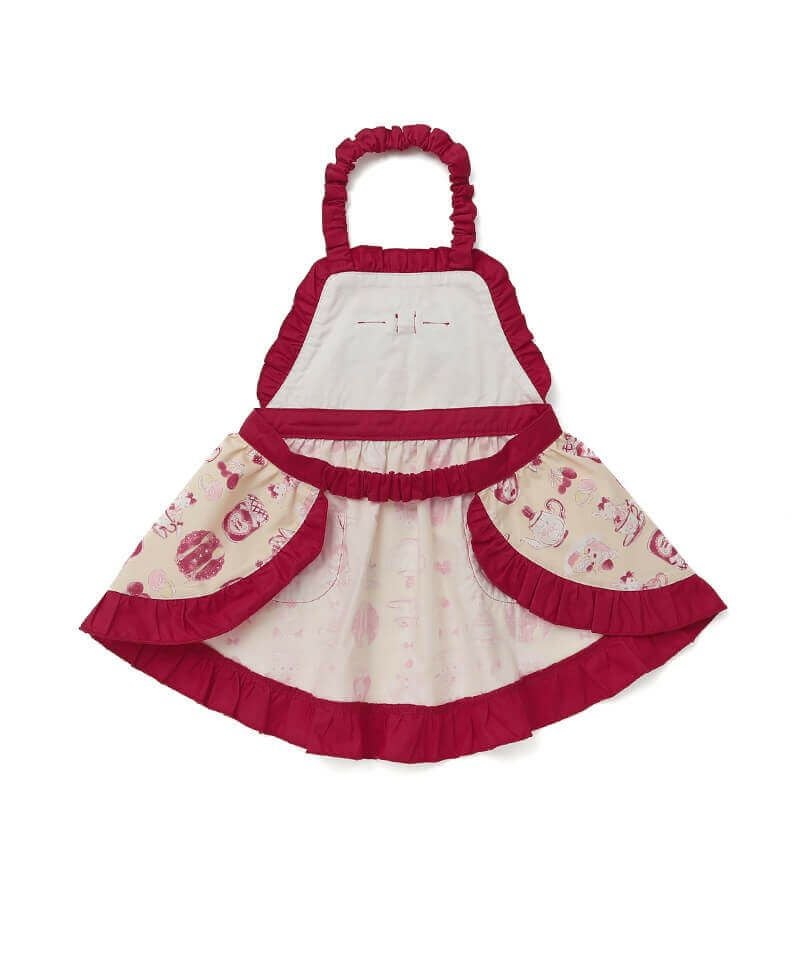 お手伝いやおままごと遊びがもっと楽しくなる♪ティータイム柄のオリジナルプリントが可愛いエプロンです。リボンやフリルをあしらい女の子らしさをぎゅっと詰め込みました。簡単に着用が出来るゴム仕様もポイントです。