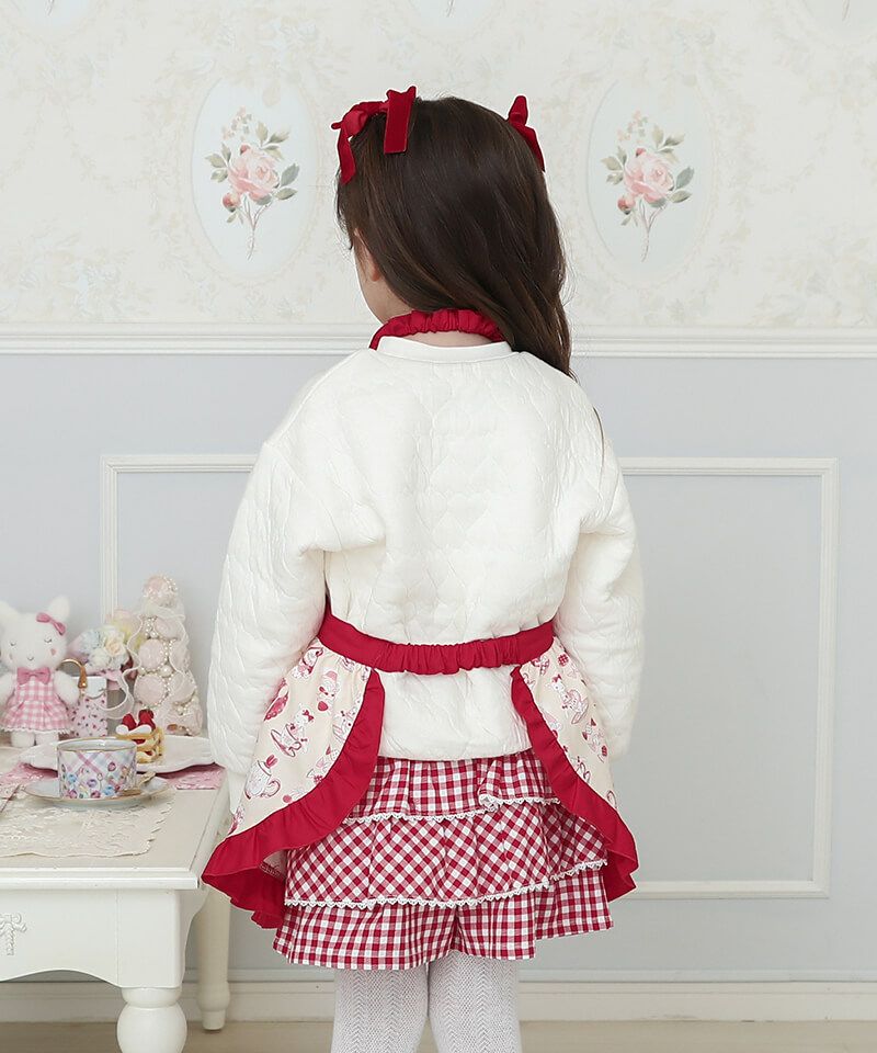 柄も生地のアイボリーと赤のコントラストもとても素敵で気分が上がります。 こちらを着けると娘も気分が上がるので、お菓子作りなど一緒に挑戦してもらおうと思います。