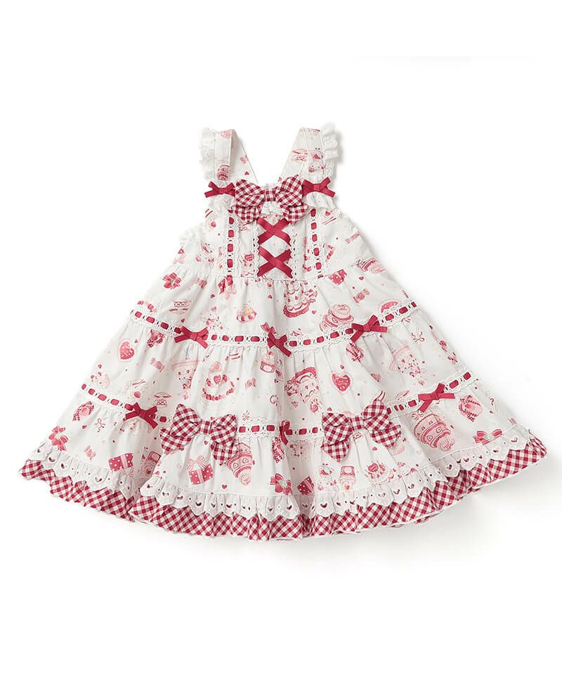 アニバーサリーイヤーをお祝いするパーティーの様子を描き起こしたオリジナルプリントのジャンパースカート。