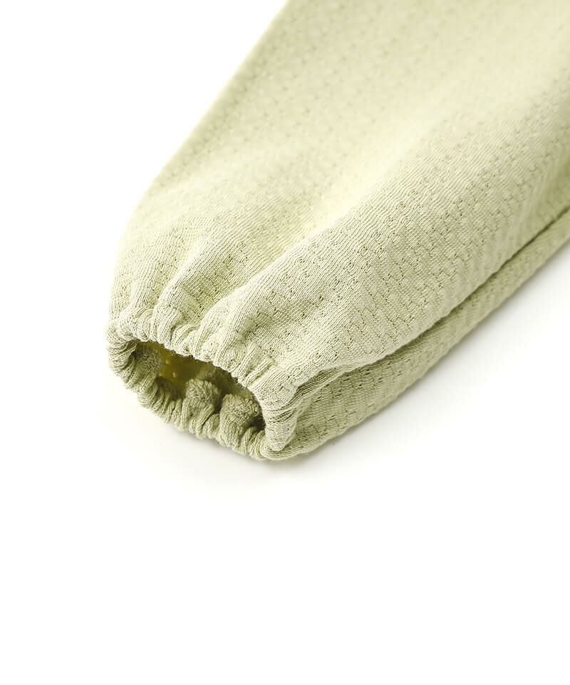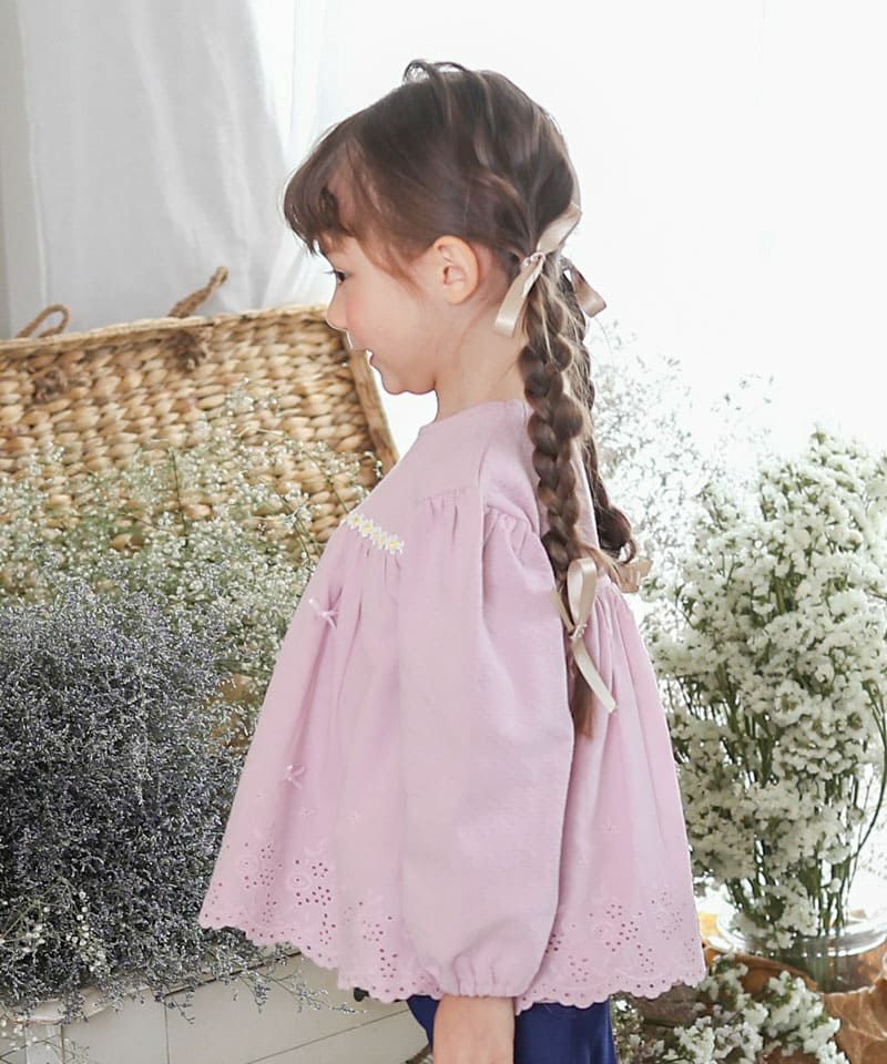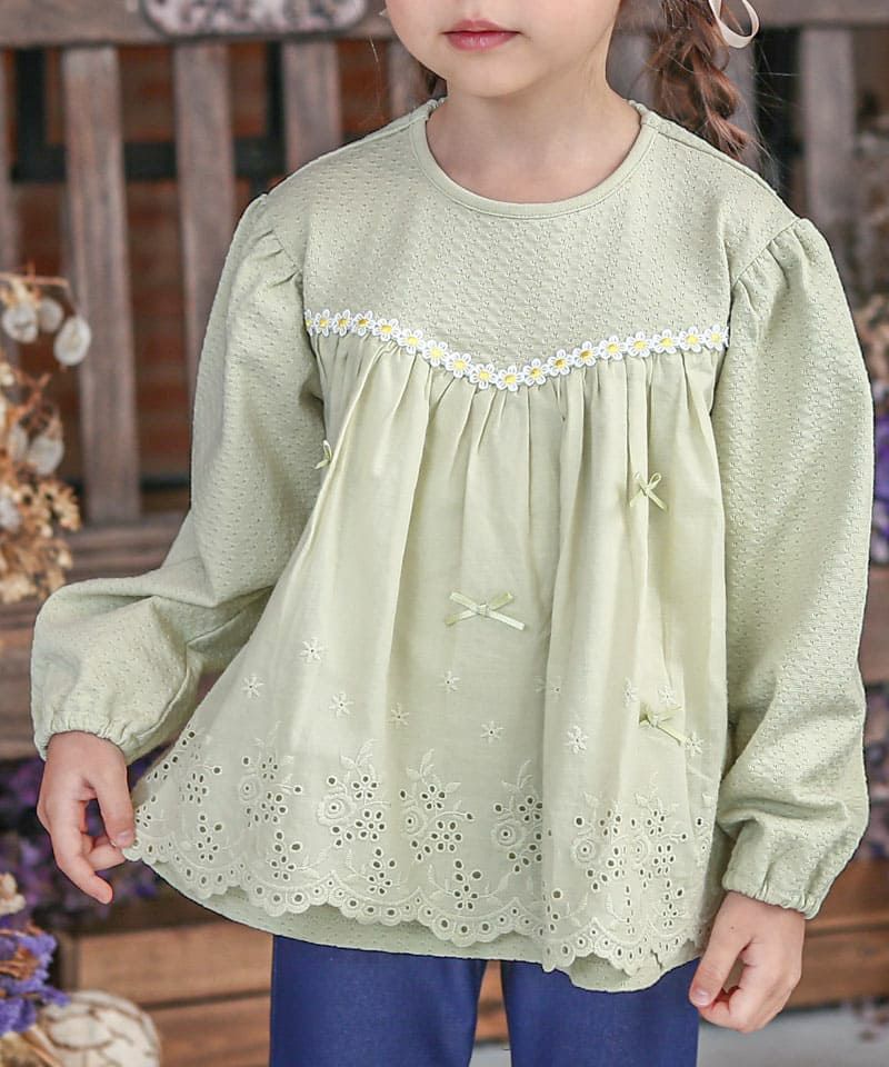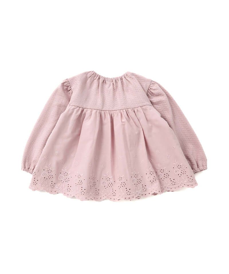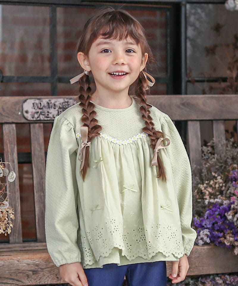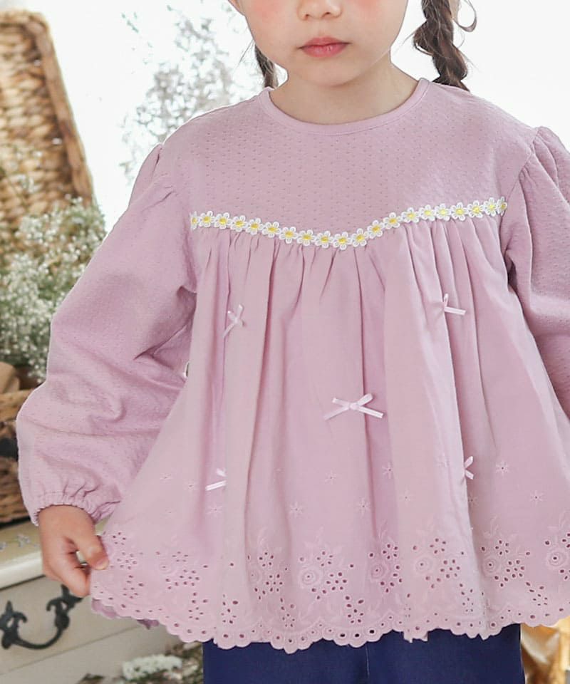 カットソーの上にコットンレース地を重ねた仕様なので着心地良く、たっぷりのギャザーが可愛いTシャツです。フラワーレースや同系色のリボンで上品な愛らしさをプラスしました。