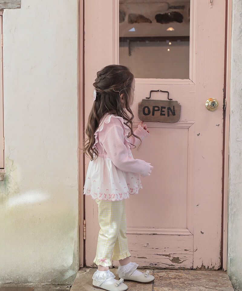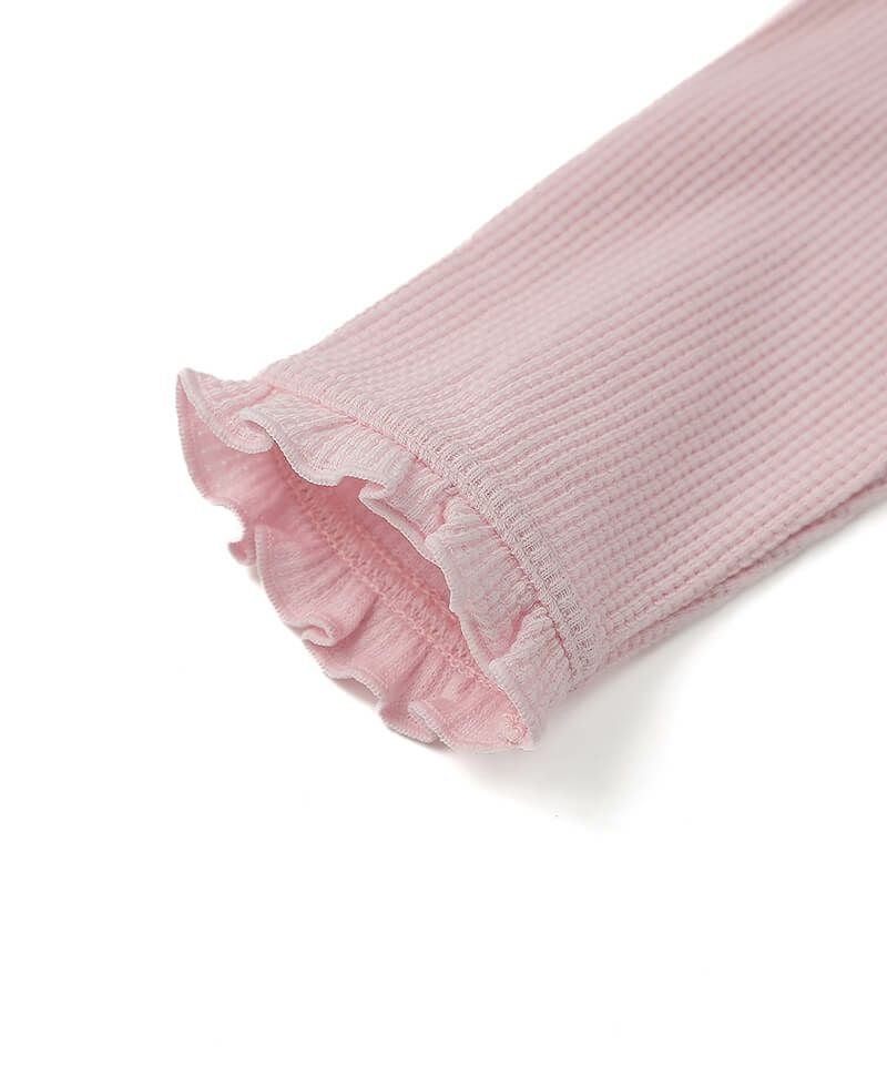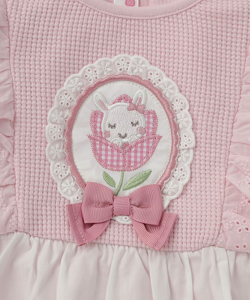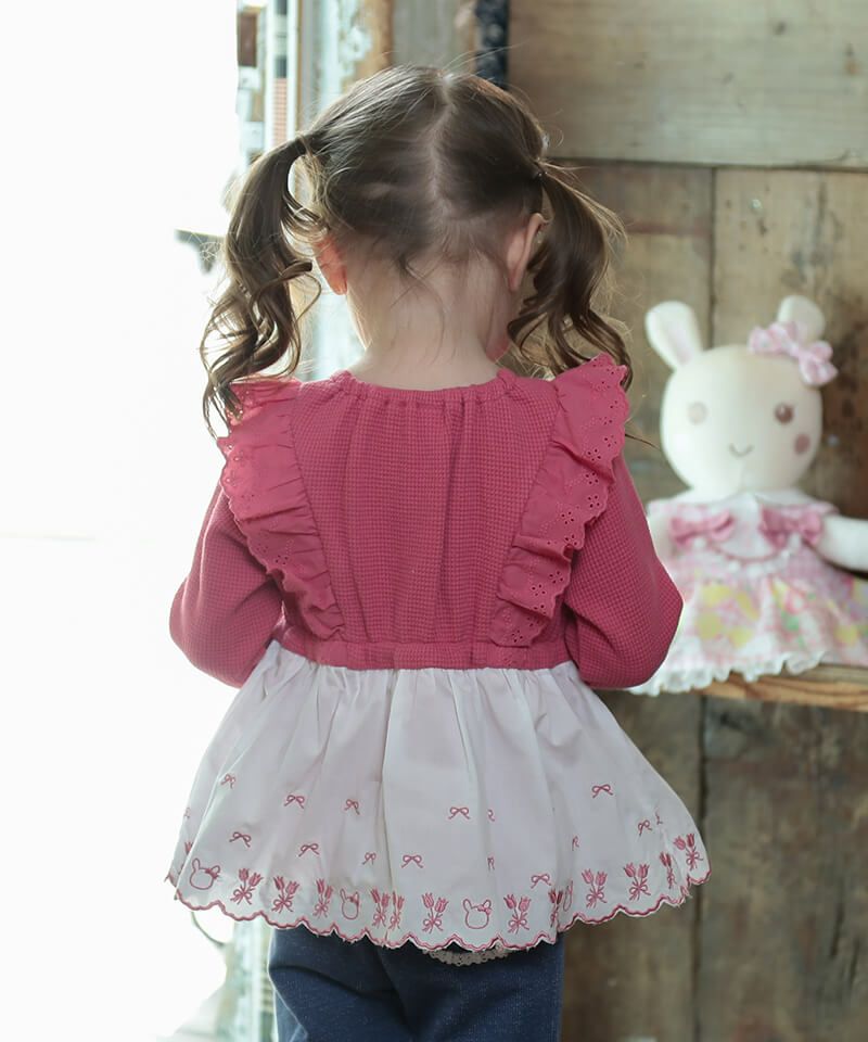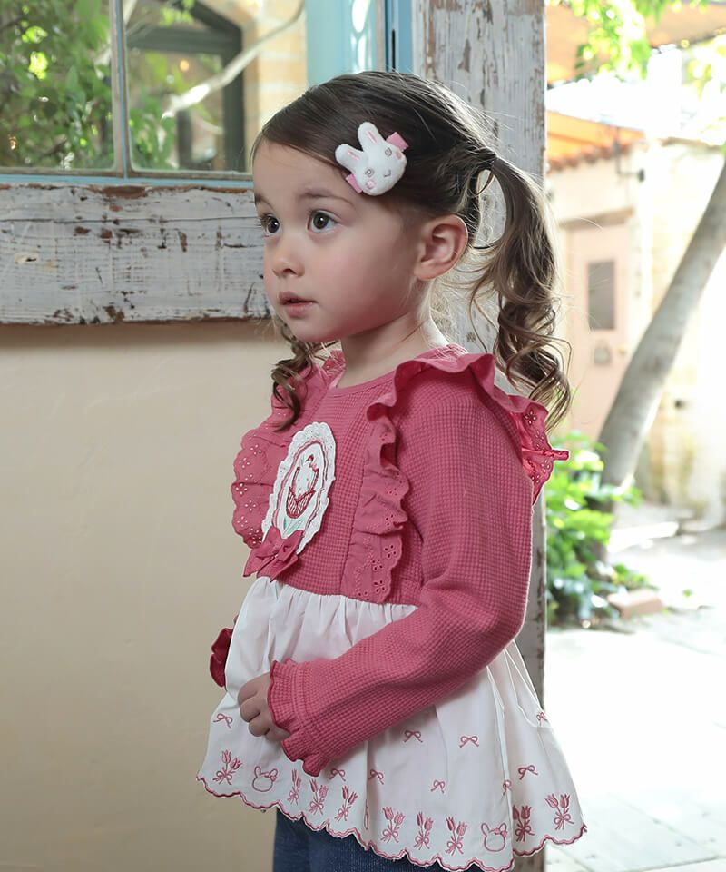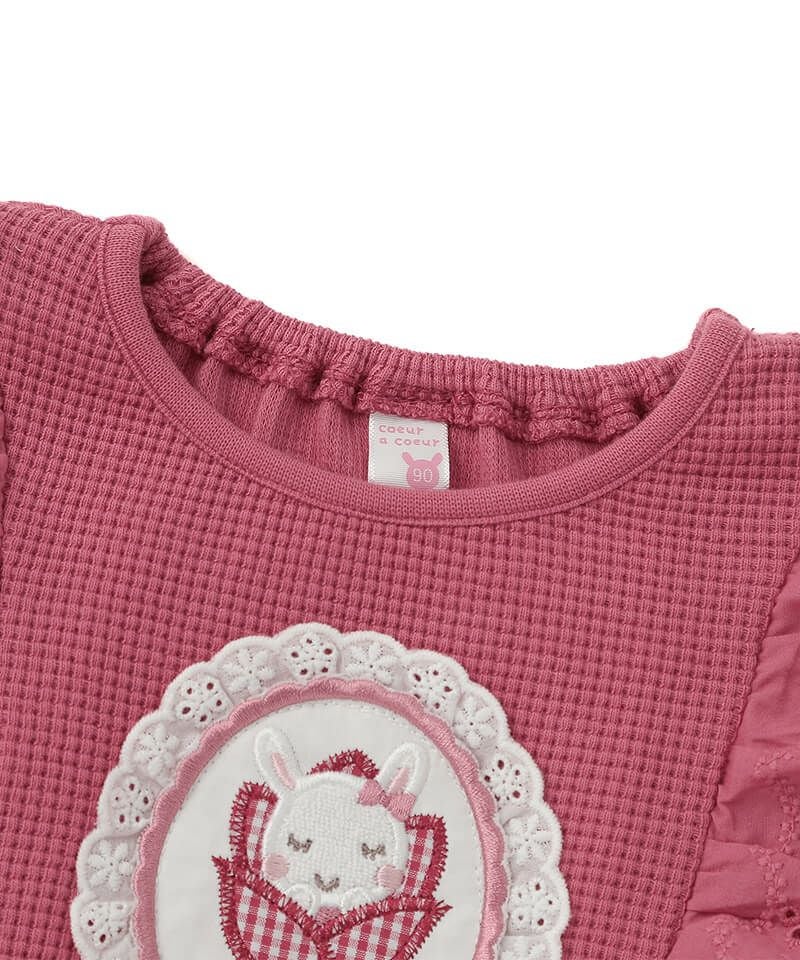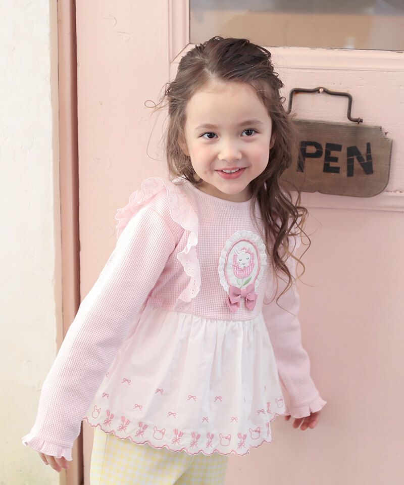 チューリップブローチ風のモチーフがラブリーなロングTシャツ。柔らかなワッフル生地はコットン素材で優しい着心地です。フリルにあしらったチューリップとうさぎちゃんのオリジナルレースがアクセントとなり可愛さいっぱい。パンツと合わせたデイリーコーデもおすすめ♪後ろネックのゴム仕様でお着替えもラクラク。同じチューリップブローチモチーフがついているヘアゴムもあるので、お揃いで楽しむのもおすすめです!