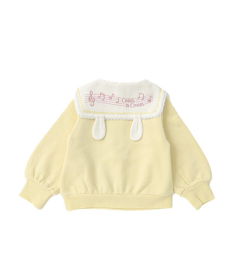 うさみみ×セーラーカラーのデザインがクーラクールらしい世界観たっぷりのプルオーバー。フロントには音符とうさぎちゃんのアップリケ刺繍をちょこんと添え、バックには音楽が聞こえてきそうな音符ラインとロゴ刺繍をあしらいました♪素材はコットン100%の厚手の裏毛素材で寒い季節にもぴったり。袖口と裾はリブ仕様でふんわりシルエットながら動きやすさもばっちり◎どんなボトムスとも合わせやすくおでかけにもデイリー使いにも大活躍の1枚です♪