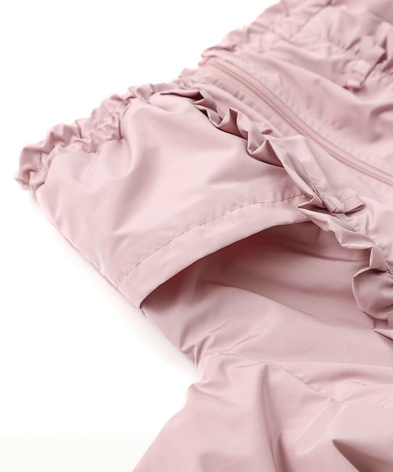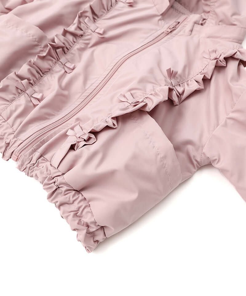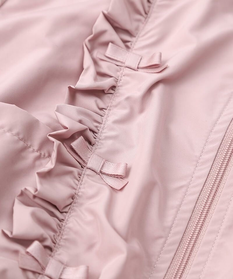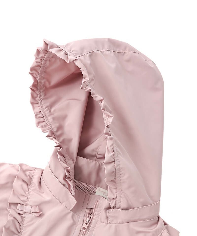 デイリーにはマストな、撥水加工とフード取外し仕様が嬉しいウィンドブレーカーです♪たっぷりのフリルとリボンをあしらい、ガーリーなムードのまま楽しめるアクティブアイテムに仕上げました♪