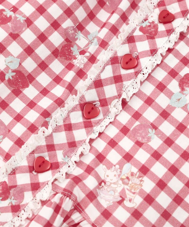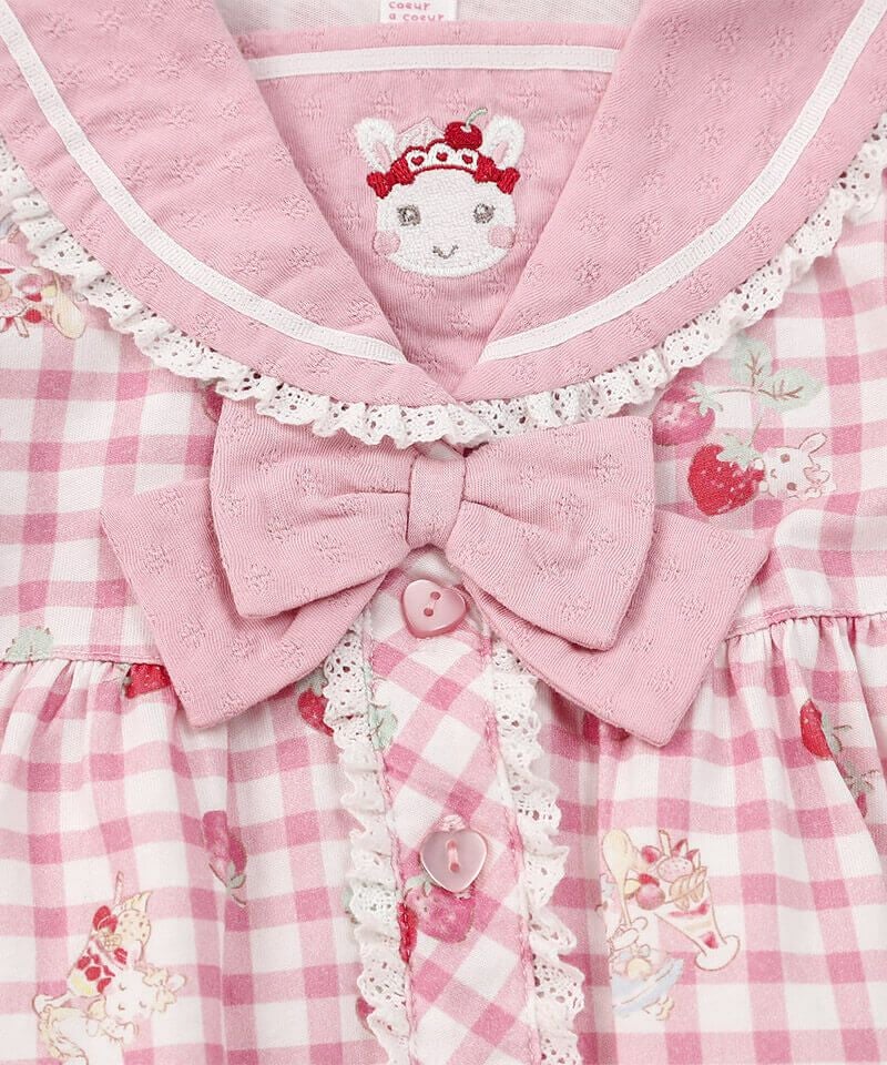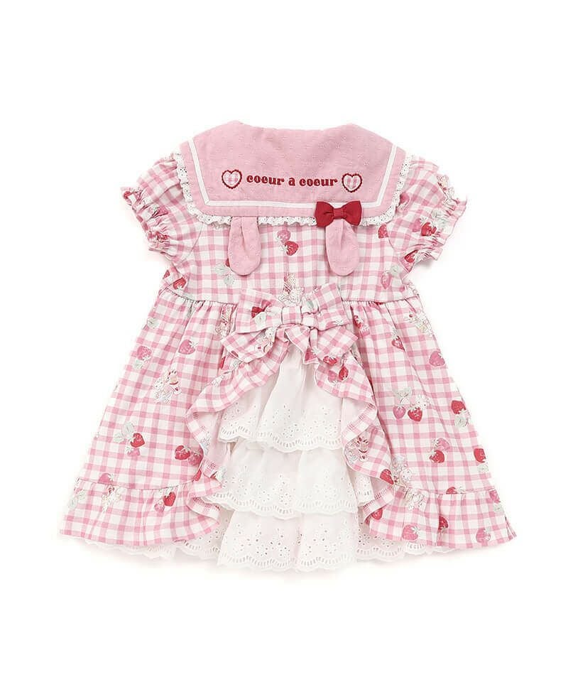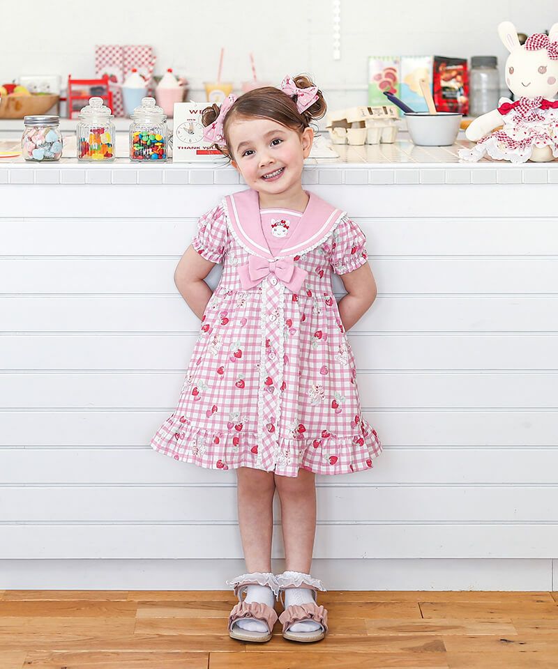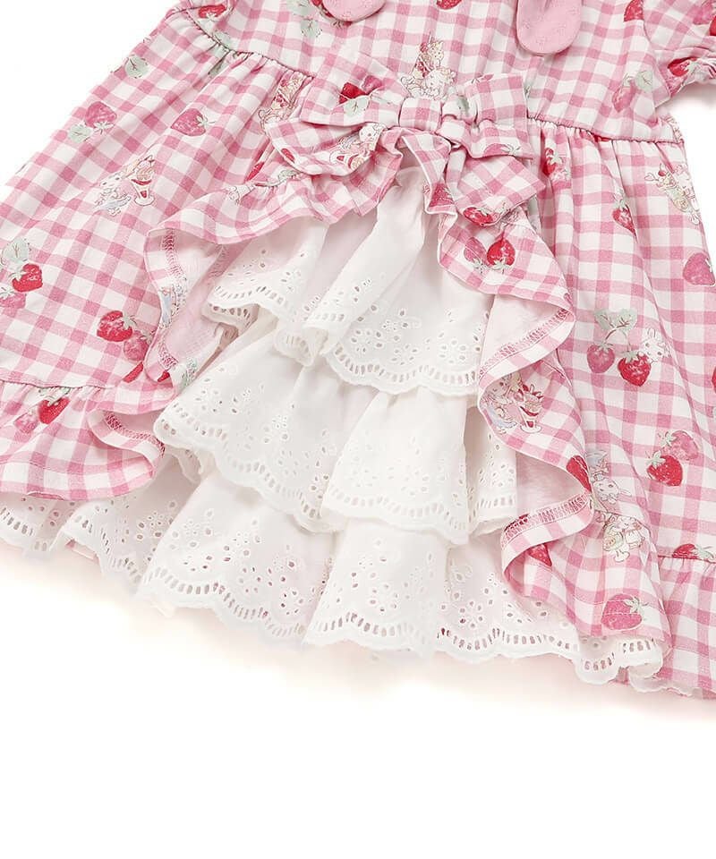 ギンガムチェックにいちごとパフェがキュートなオリジナルプリントのワンピース。うさみみセーラーにホイップをちょこんとのせたうさぎちゃんアップリケ、さらにバックフリルのレースと360度スウィートなデザインに仕上げました♪さらっとした肌触りのカットソー素材で着心地が良く、1枚でおでかけスタイルがcuteに決まります。