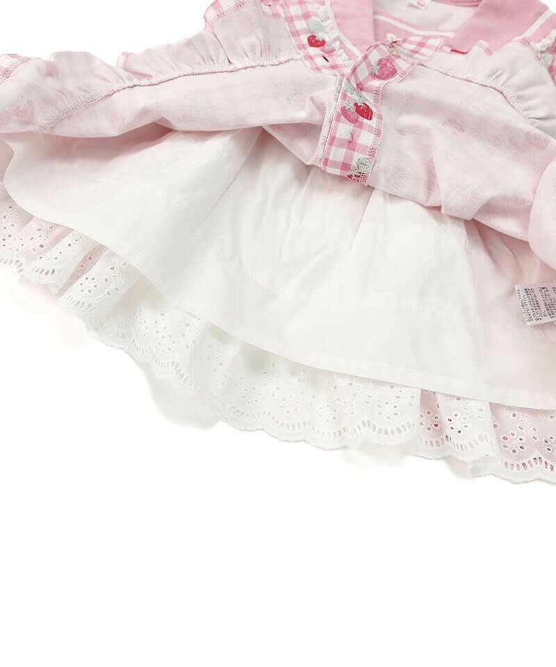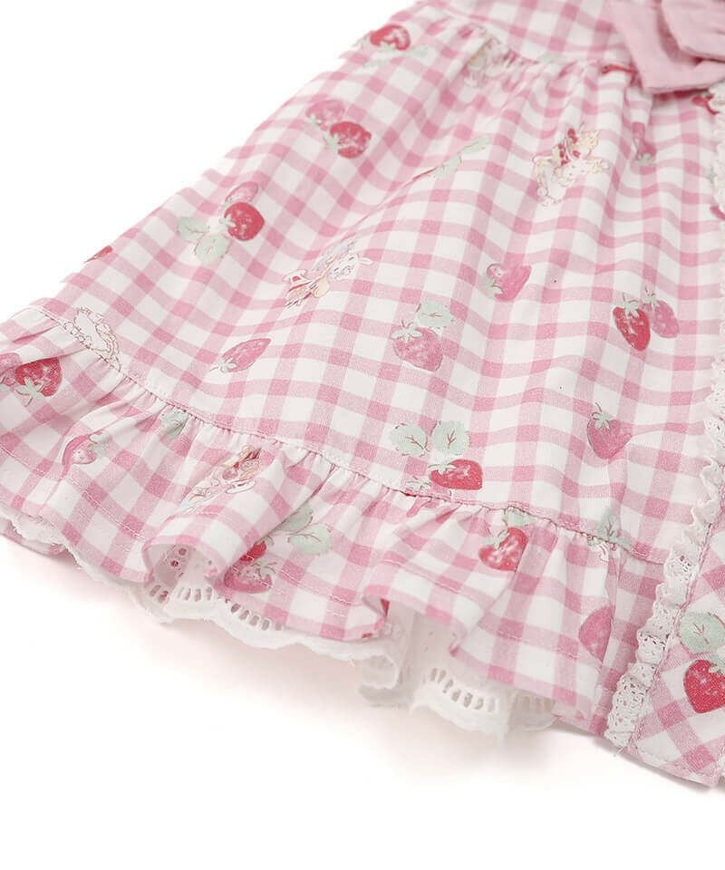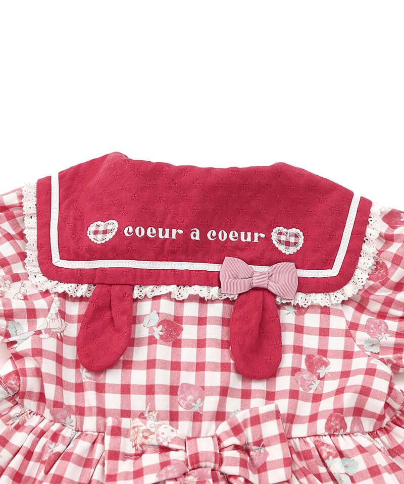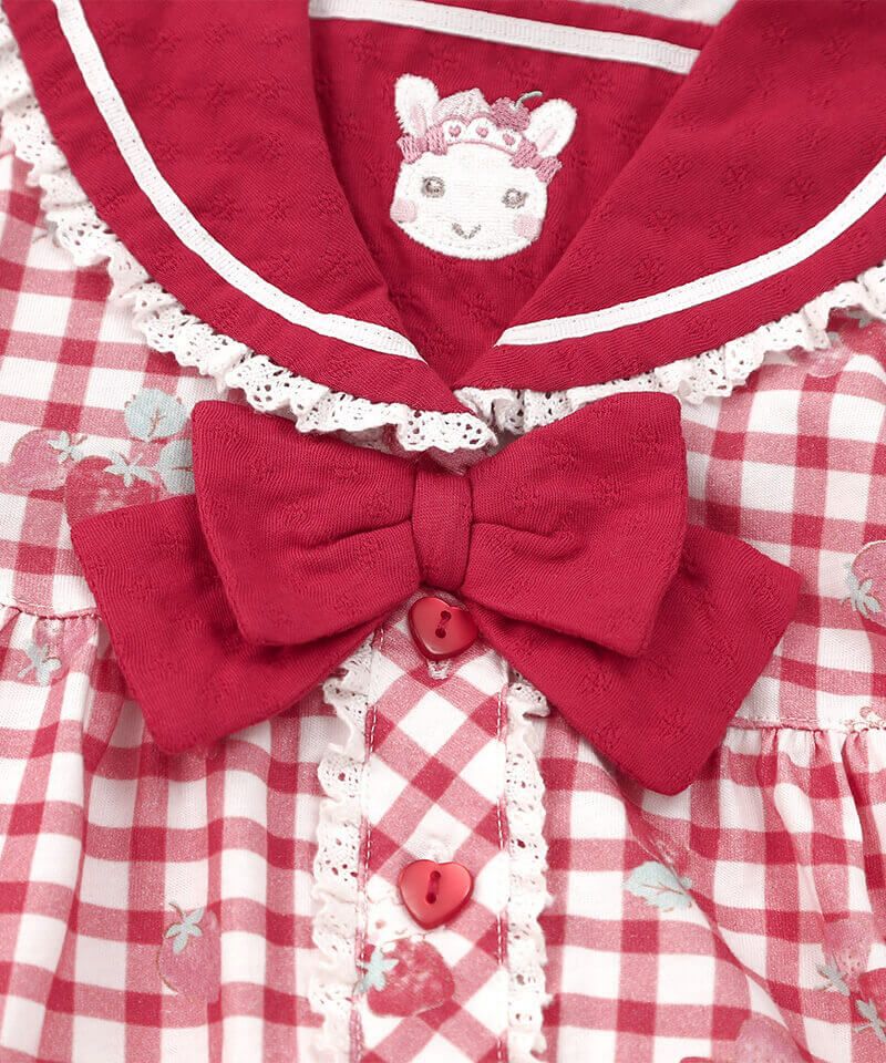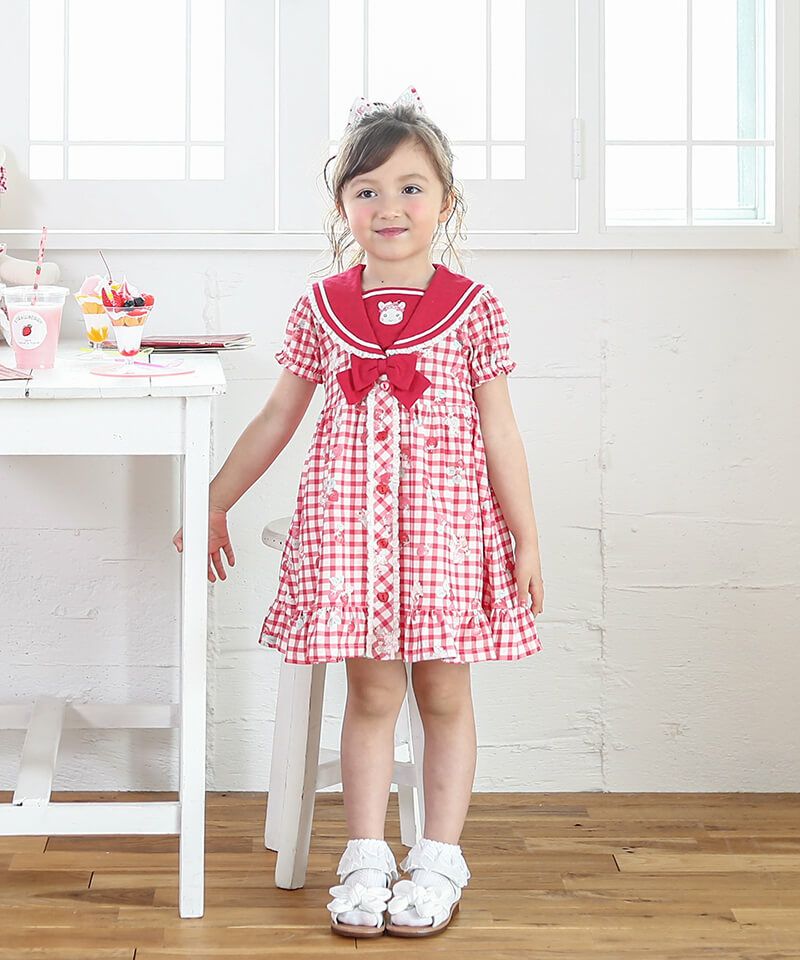 ギンガムチェックにいちごとパフェがキュートなオリジナルプリントのワンピース。うさみみセーラーにホイップをちょこんとのせたうさぎちゃんアップリケ、さらにバックフリルのレースと360度スウィートなデザインに仕上げました♪さらっとした肌触りのカットソー素材で着心地が良く、1枚でおでかけスタイルがcuteに決まります。