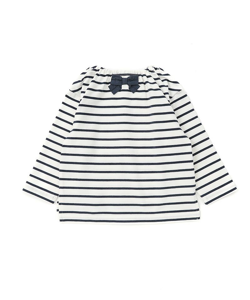 シンプルながらもスカラップネックが絶妙な存在感を演出してくれるTシャツです。レトロムード漂うカラーは今季のトレンドアイテムでもあり、パリジェンヌみたいなシンプルコーデがおすすめ♪スカラップカラーとバックリボンが子供らしい愛らしさも添えてくれる1枚です。