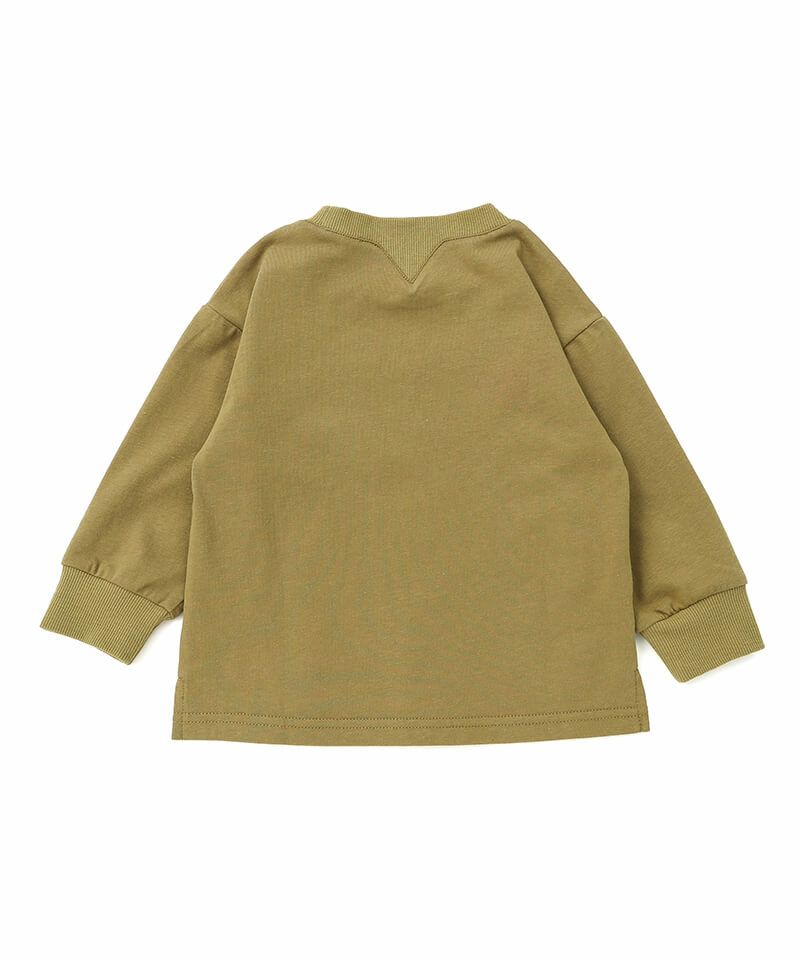 プリントでは出せない刺繍独特の風合いとキッズらしい遊びの効いたモチーフのミックス感が素敵です。ややハリのあるボーイッシュなお素材を使用しています。ボックスシルエットや、お袖のリブ、バックネックの変形ラインが際立ちます。