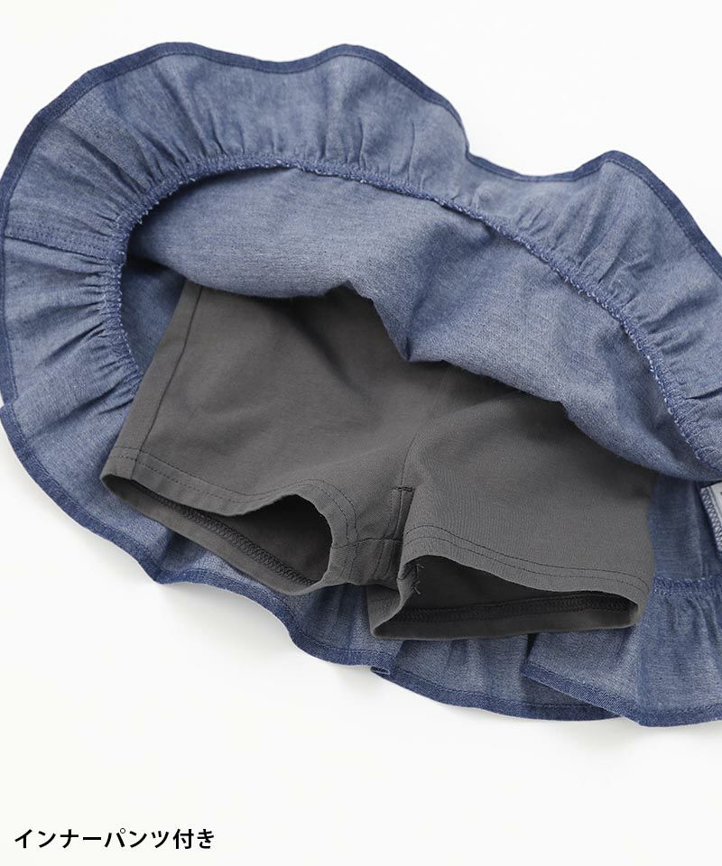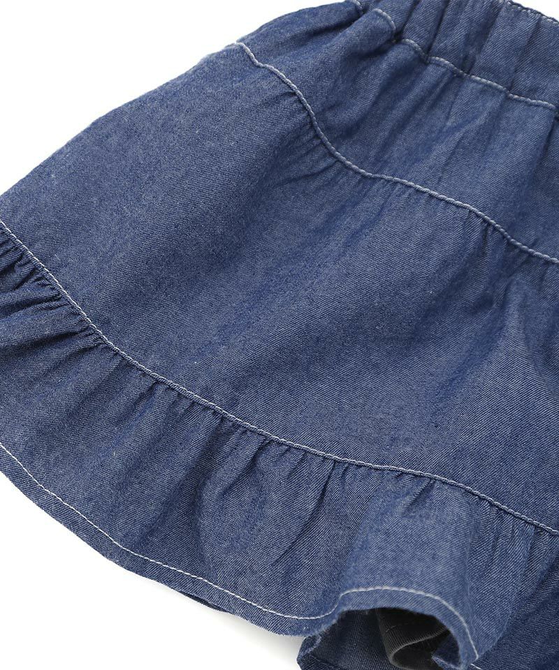 ちょっぴりレトロな裾フリルがトレンド感あるシルエット♪薄手のインナー付きなのも嬉しいポイント。軽くて柔らかさもあるライトオンスのデニムを使用していますので真夏も楽しんでいただけるアイテムです。