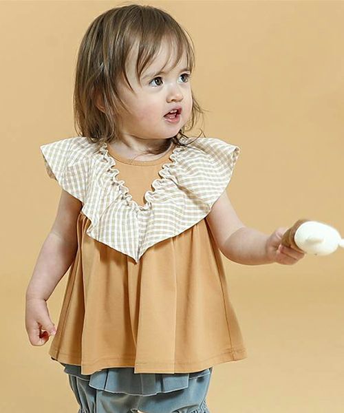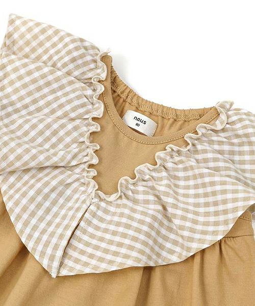 ■ブランド n.o.u.s ■アイテム 半袖Tシャツ ■素材 本体/綿100% 衿ぐり・袖口部分/綿96%・ポリウレタン4% ブラウン…フリル布/綿100% ネイビーブルー…フリル布/綿53%・ポリエステル47% シルケット天竺×サッカーギンガム×スパンフライス ■サイズ 70/80/90 ■洗濯表示