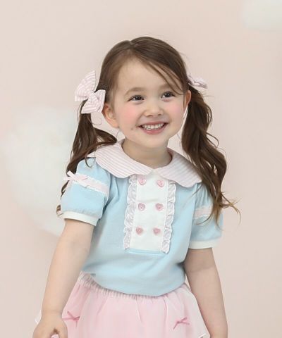 ピンクと水色の組み合わせって意外とないですが、とてもかわいいです。 スカラップの襟にフリル、リボンとかわいい要素たっぷりです。 ジャンパースカートとあわせて襟を出してもかわいいです。