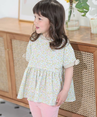 ゆったりシルエットで、小花柄と袖のリボンがかわいいです。ショートパンツを合わせて着ています。