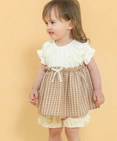 7ヵ月の娘にクリームを購入しました。モデルさんのスタイリングが可愛いなと思い、商品番号48166-231b-のショートパンツと合わせることが多いですが、丈感がしっかりあるので暑い日は1枚で着せています。色味と切り替え部分のギャザーが可愛くて気に入っています。