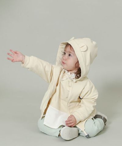 薄手のトレーナーの様な生地で、シンプルでとても使いやすいです。 クマ耳フードと、ジッパーの持ち手部分のクマのマークが特徴的でお気に入りです。