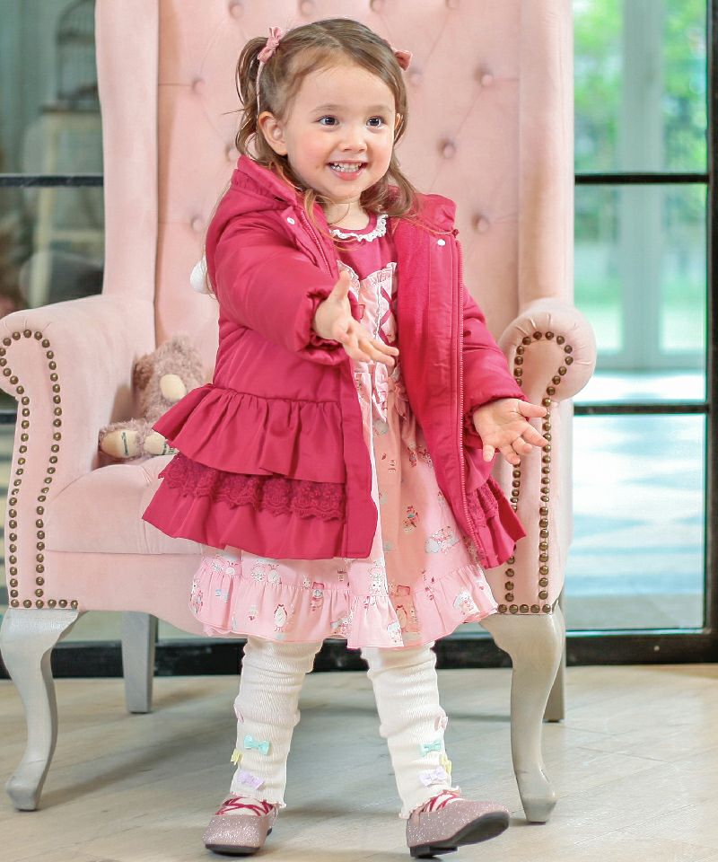 110サイズ前半のときに100のピンクを購入しました。 小柄だからかちょうどよく着られ、ややもこもこと暖かく着られました。 裾の一周したフリルから覗くレースやリボンにうさみみ、着るととてもラブリーでかわいいです。