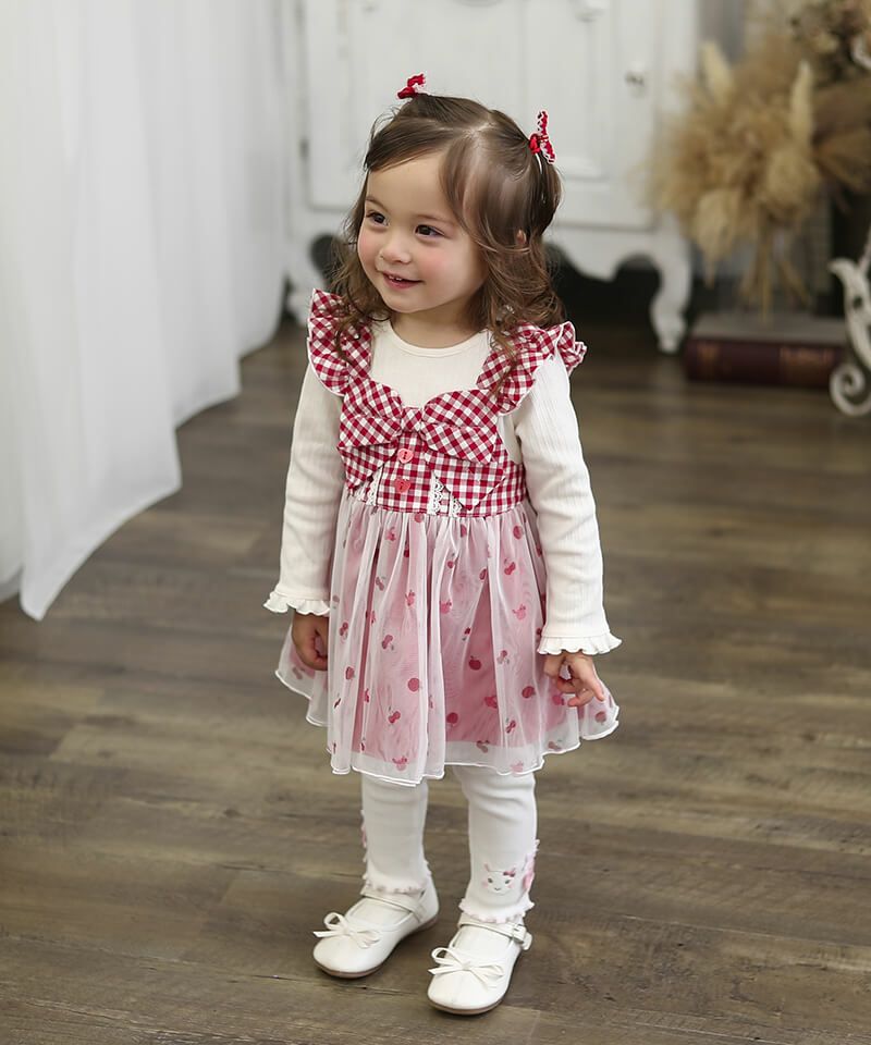 チュールにさくらんぼとりんご柄が可愛いです♡裏地がカラーなところやボタンがハートなのも可愛いです♡ -
